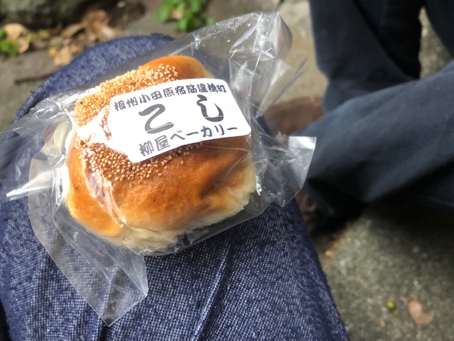 ムラサキシキブやホトトギスなどの茶花が咲いて(実って)おり、茶の文化も持つ小田原らしい趣があります。途中で荻窪用水とつながるそうです。名前が同じ東京の荻窪は、土屋さんが先日まで住んでいたところなので、名前の偶然の一致に興味を惹かれました。私たちはあんパンを食べられるところを探しながら歩きました。用水に沿って、また外れて住宅地を歩くうちに美しい竹藪に沿った細い石段に行き当たりました。そこで石段に座って先ほどあんパン屋さんで購入したパンでおやつタイム!半分ずつ食べましたがどのあんパンも薄い皮がもちもちしてとても美味しかったです。あんパンというよりむしろ和菓子のようでした。