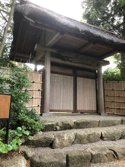 土屋さんに促されて見上げると、「板橋 竹の小道に『竹垣』プロジェクト」の看板!いろいろ活動をされている方がいるようです。食べ終えるとさっさと歩き出す土屋さんを慌てて追って階段を上るとうっそうとした木立の中に古めかしい茅葺きの門が!立て看板を読むと、なんとここが山形有朋邸(古希庵)!公開は日曜日の10時から4時!残念!もう4時を過ぎています。また来ようと心に決めてそこを離れました。
